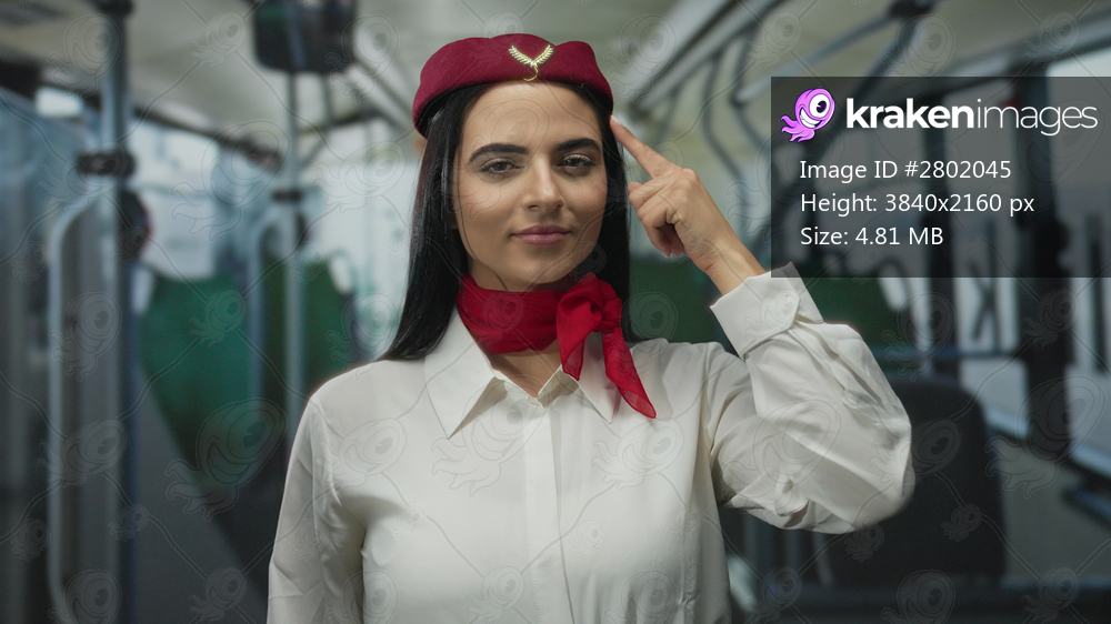 Hispanic flight attendant woman in uniform gestures confidently on a bus, showcasing teamwork skills in an indoor transport setting with confident expression. - Kraken Images