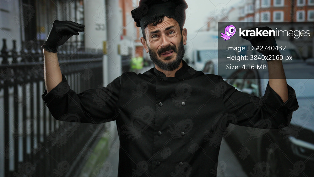 Hispanic male chef with a beard gestures expressively on a bustling street, clad in black attire and gloves, showcasing culinary passion outdoors with vehicles in the background. - Kraken Images