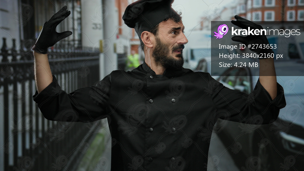 Hispanic male chef with a beard gestures expressively on a bustling street, clad in black attire and gloves, showcasing culinary passion outdoors with vehicles in the background. - Kraken Images