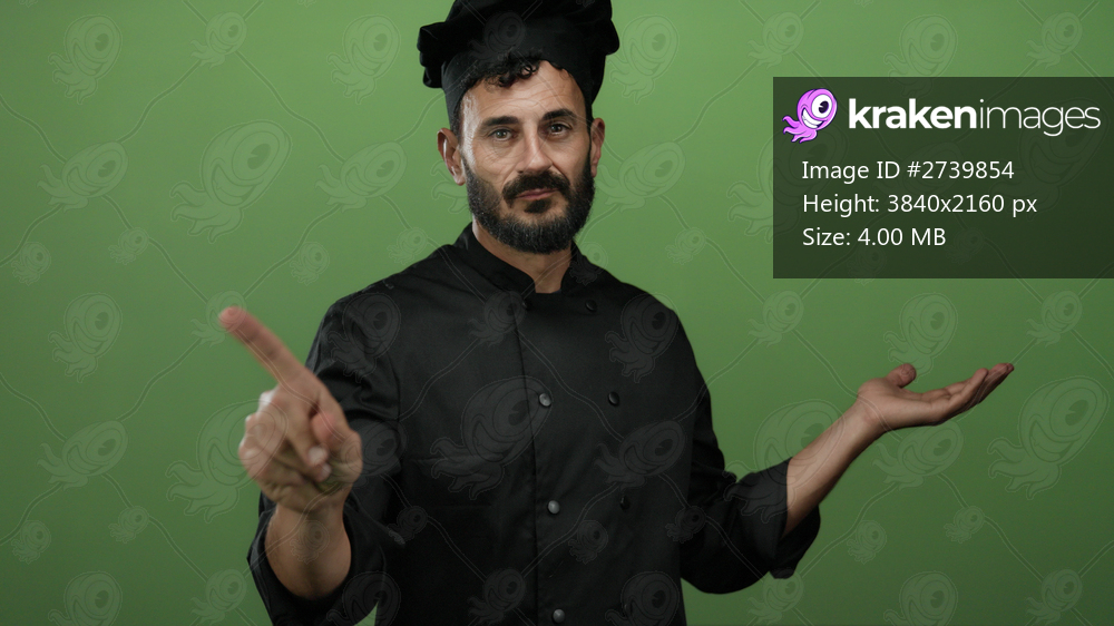 Hispanic male chef with a beard in black uniform gestures no with his finger against a green background, conveying disapproval in a culinary context.