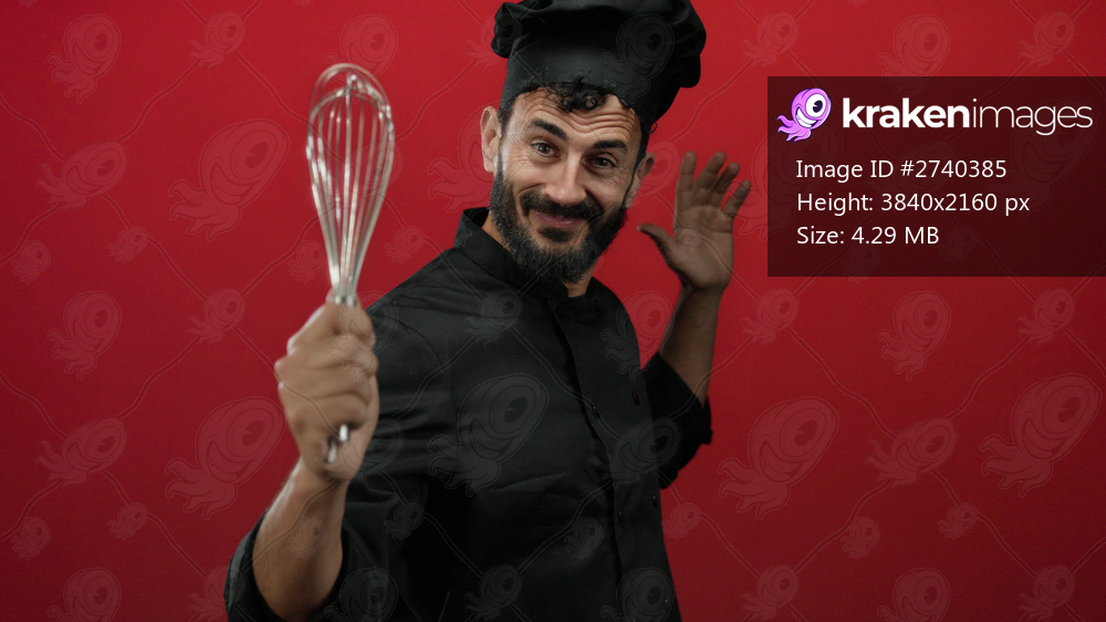 Hispanic male chef with a beard joyfully holding a whisk against a vibrant red background, showcasing culinary enthusiasm and professional attire.