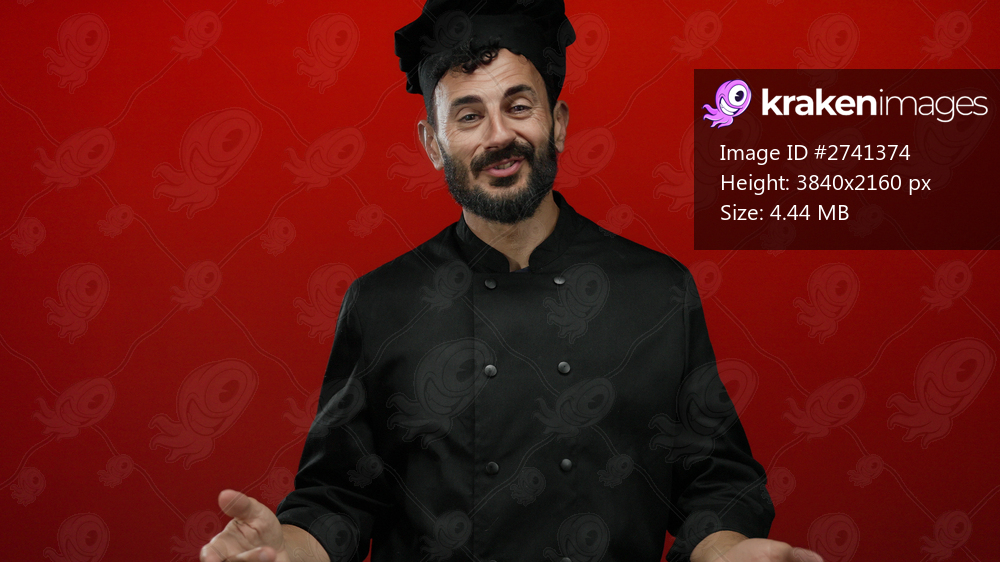 Hispanic male chef with a beard smiles while waving against a vivid red backdrop, wearing a black uniform that highlights his welcoming and professional culinary presence. - Kraken Images