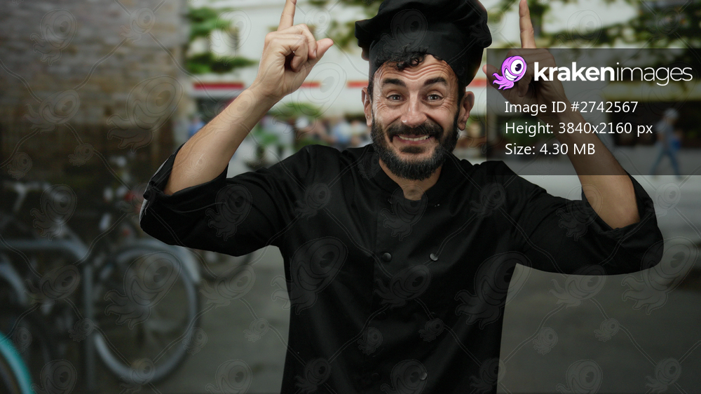Hispanic male chef with a beard smiling outdoors on a street, pointing joyfully upwards in a casual urban setting.