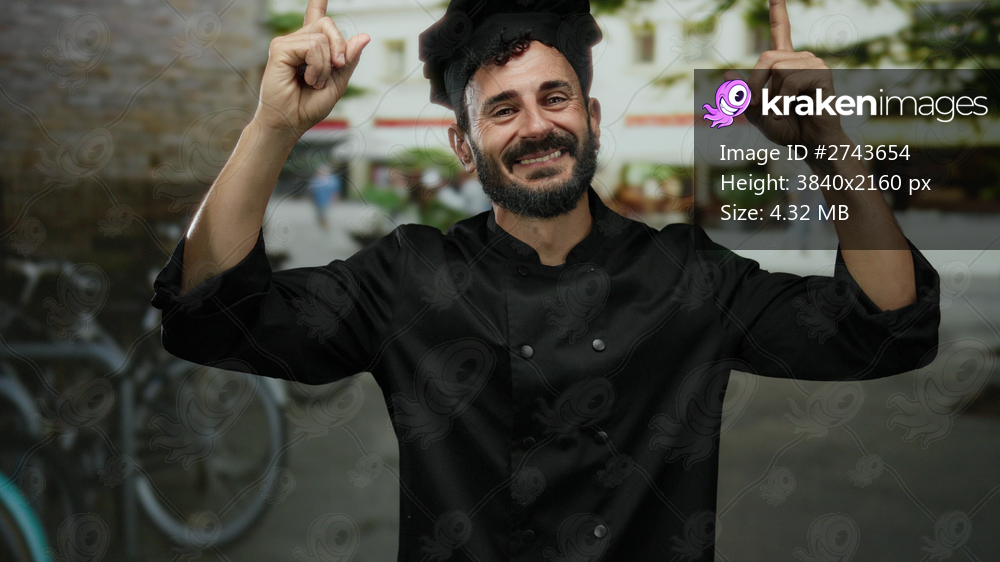Hispanic male chef with a beard smiling outdoors on a street, pointing joyfully upwards in a casual urban setting.
