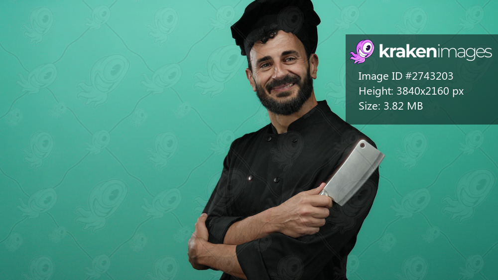 Hispanic male chef with a beard stands confidently in a black uniform gripping a cleaver against a vibrant green background.