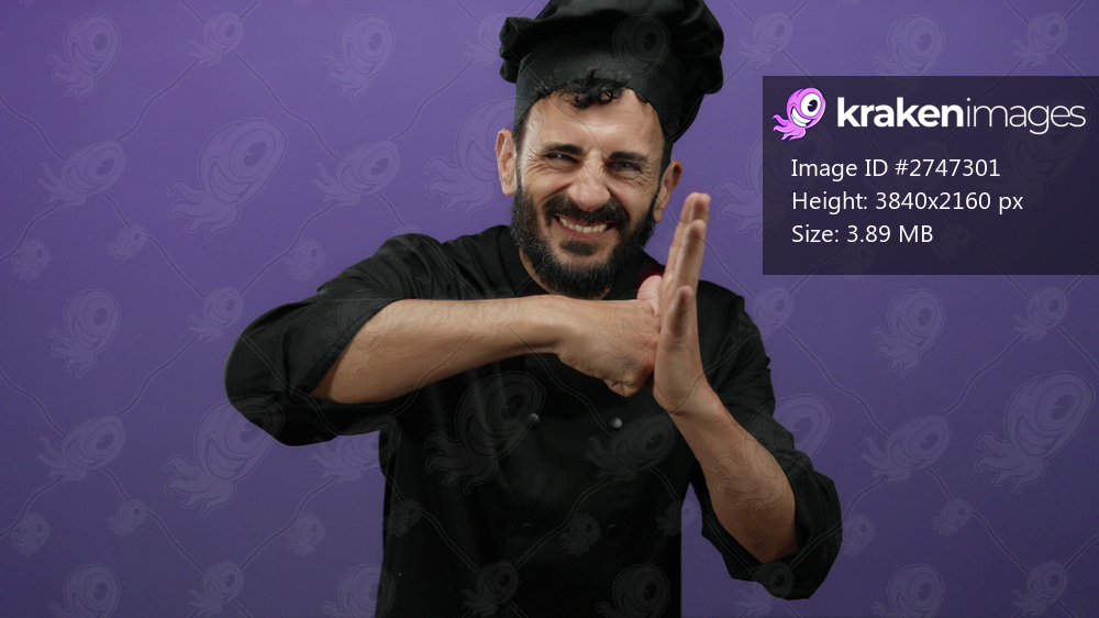 Hispanic male chef with beard in black uniform claps fist into palm as a gesture against a purple background, showcasing a playful and energetic expression. - Kraken Images
