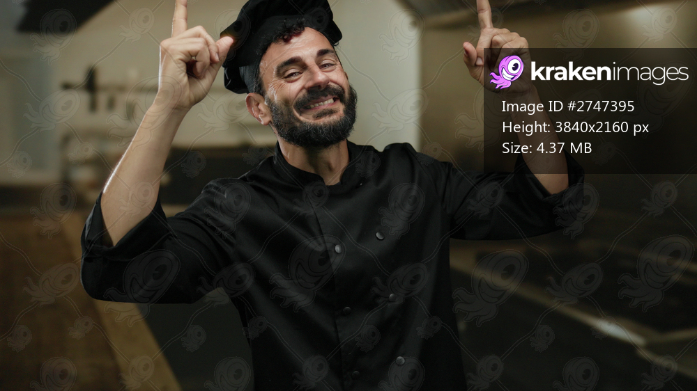 Hispanic male chef with beard pointing upwards in a professional kitchen, showcasing enthusiasm and expertise while wearing a traditional black chef uniform. - Kraken Images