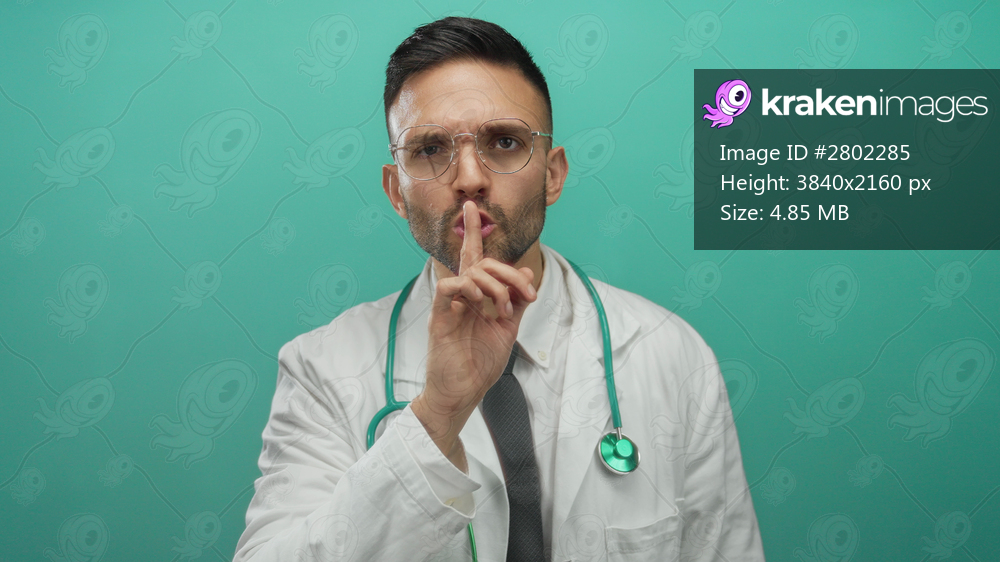 Hispanic male doctor in white coat with stethoscope gestures for silence against a vibrant blue background, conveying a sense of confidentiality and professionalism. - Kraken Images