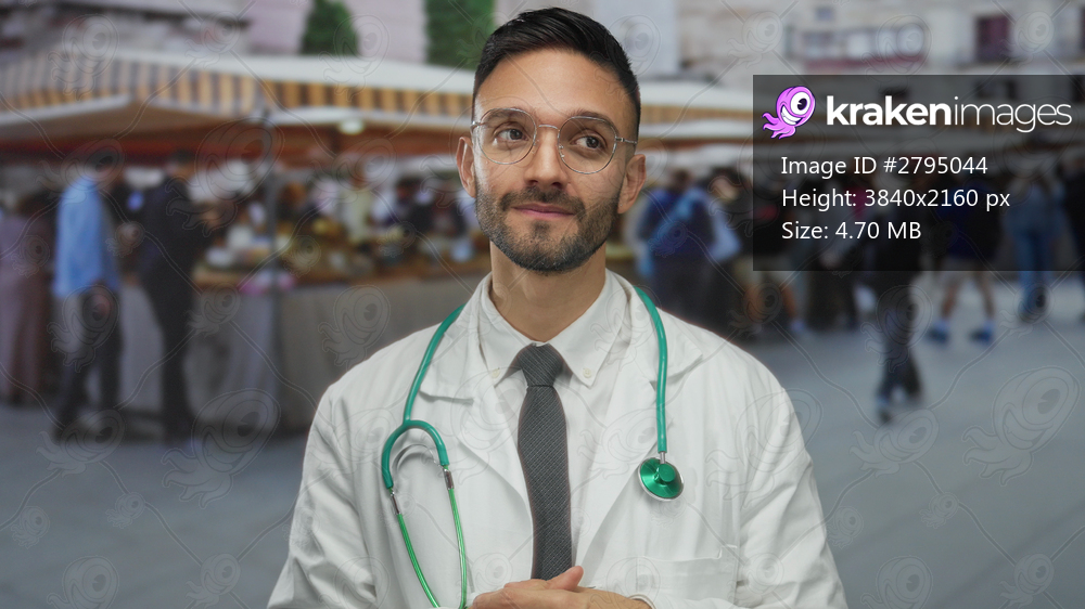 Hispanic male doctor standing outdoors on an urban street wearing a white coat with stethoscope surrounded by city people bustling around in the background. - Kraken Images