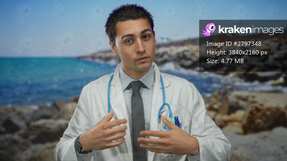 Hispanic male doctor with stethoscope and uniform standing by the seaside, signifying healthcare and wellness outdoors at a beautiful beach setting.