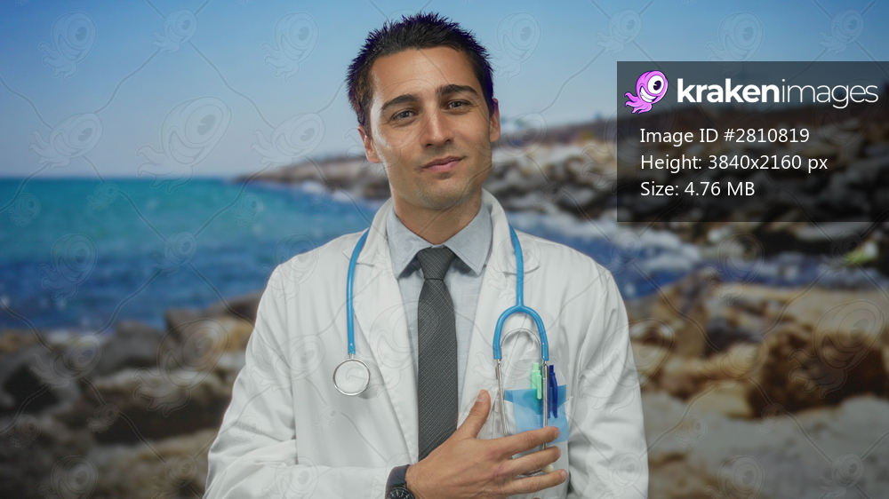 Hispanic male doctor with stethoscope and uniform standing by the seaside, signifying healthcare and wellness outdoors at a beautiful beach setting.