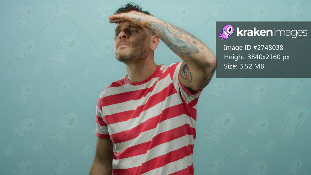 Hispanic male looking intently into the distance, standing against a solid blue background, highlighting his tattoos and casual striped shirt with confident posture. - Kraken Images