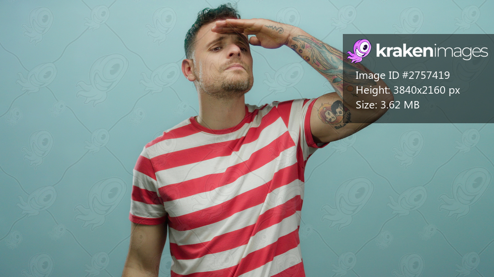Hispanic male looking intently into the distance, standing against a solid blue background, highlighting his tattoos and casual striped shirt with confident posture. - Kraken Images