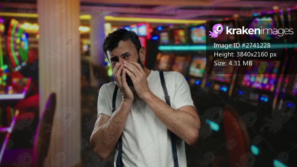 Hispanic man with a beard appearing afraid in a vibrant casino setting surrounded by colorful slot machines and neon lights.