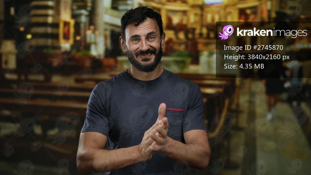 Hispanic man with a beard claps hands indoors in a beautifully lit catholic church setting, conveying warmth and cultural richness in fine detail.