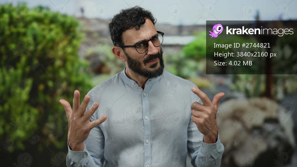 Hispanic man with a beard counting on fingers in a lush green park, surrounded by vibrant trees, wearing glasses and a light blue shirt, embodying thoughtful contemplation. - Kraken Images