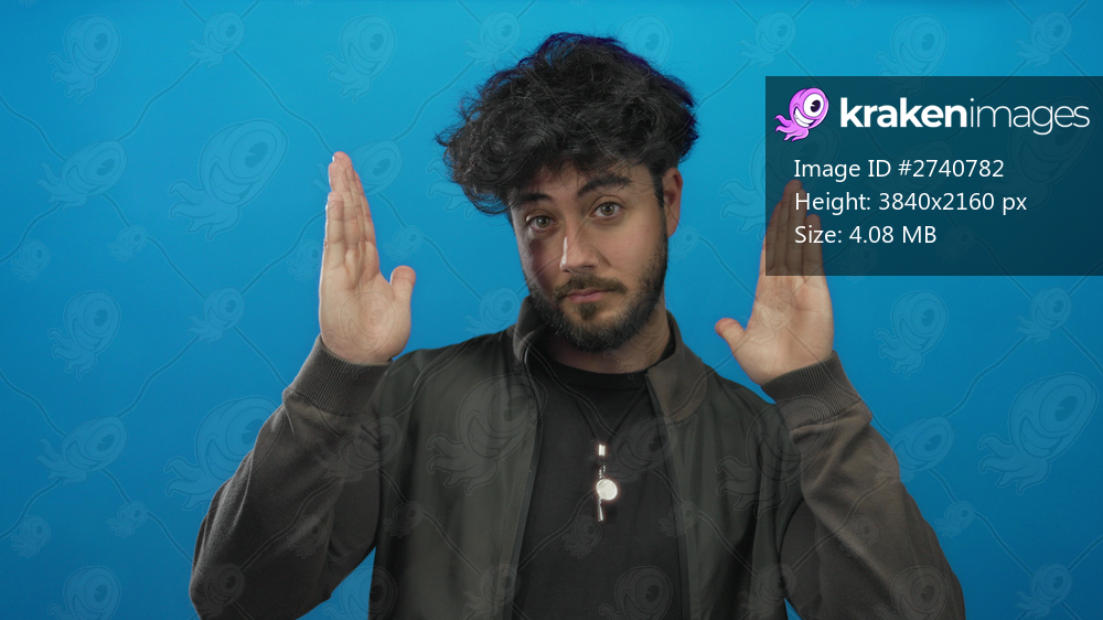 Hispanic man with a beard gestures enthusiastically in front of a vibrant blue background, showcasing an expressive and creative energy.