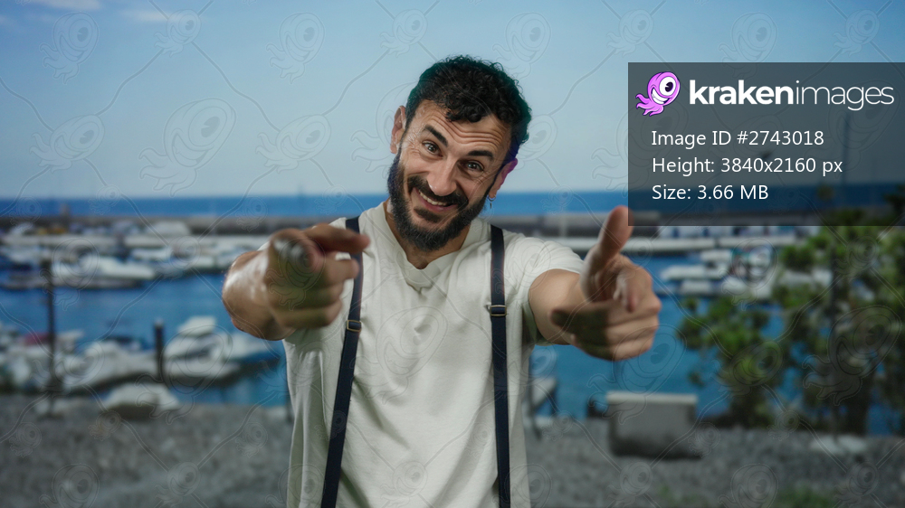 Hispanic man with a beard gestures happily at a port setting, framed by the blue sea, boats, and distant ships, creating a lively maritime atmosphere.