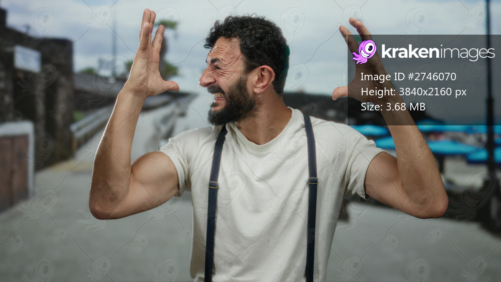 Hispanic man with a beard gesturing emotionally on a seaside promenade with a beach and sea in the background.
