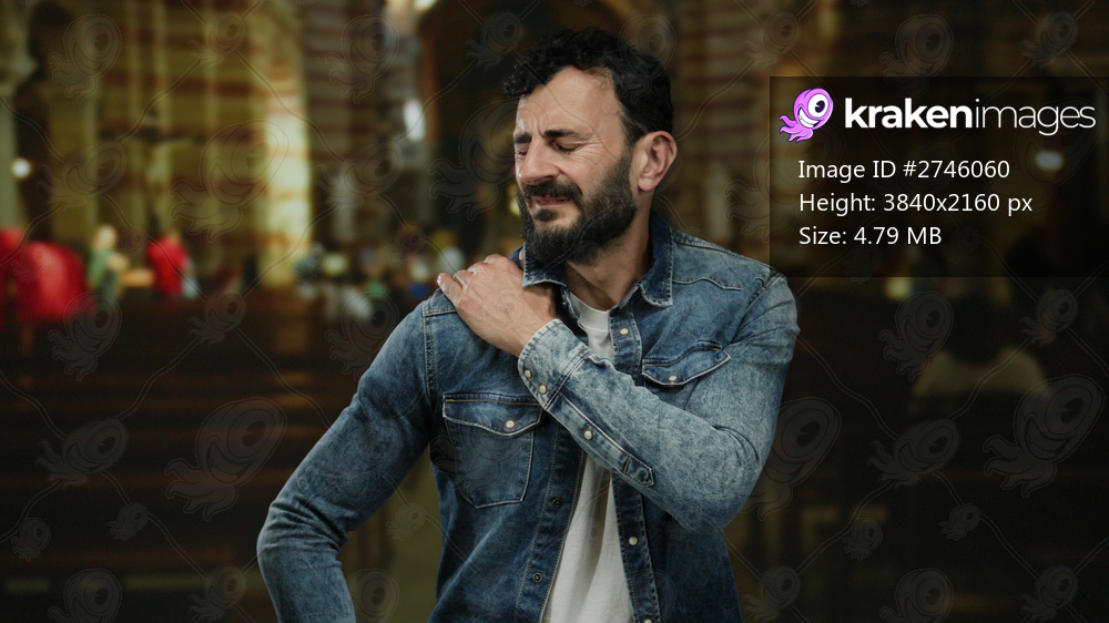 Hispanic man with a beard in a denim jacket stands indoors in a catholic church, expressing discomfort while holding his shoulder.