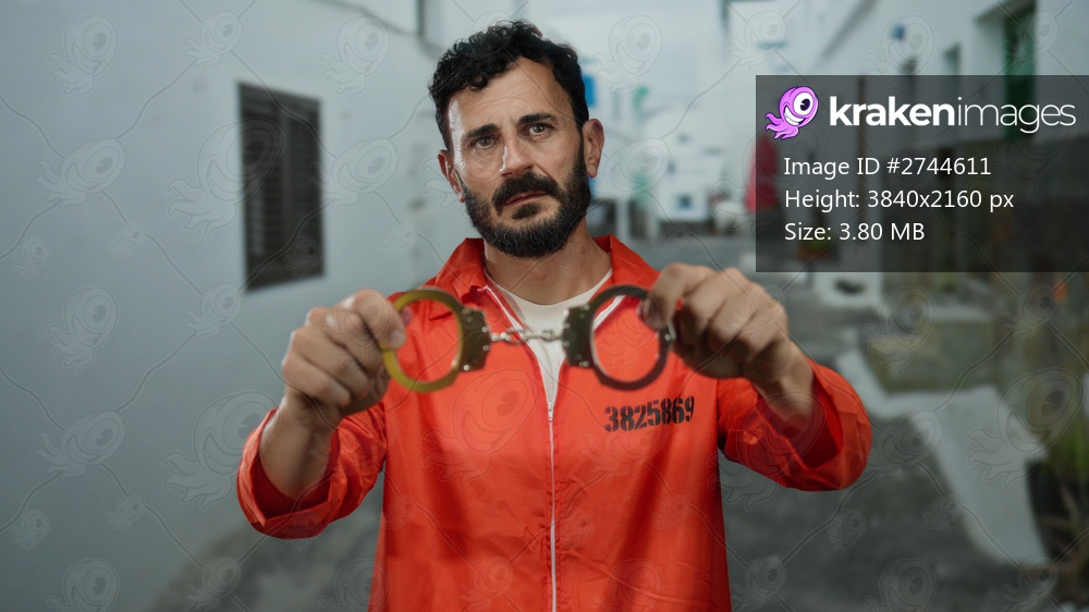 Hispanic man with a beard in an orange prison jumpsuit stands outdoors holding handcuffs on a street, portraying a detainee or escaped prisoner scenario in a public setting. - Kraken Images