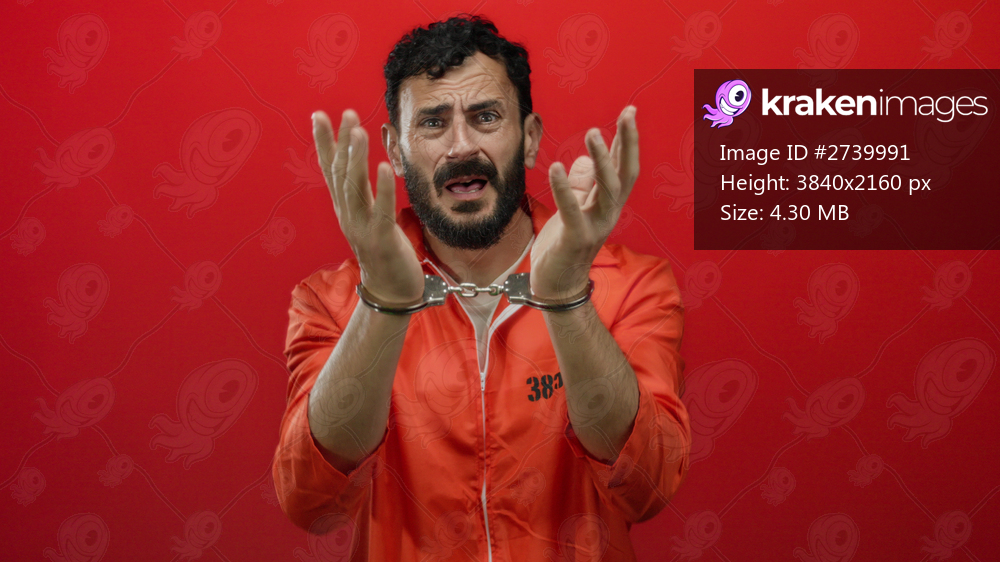 Hispanic man with a beard in an orange prison jumpsuit, wearing handcuffs, stands against a vivid red background, depicting a scene of incarceration and constraint. - Kraken Images
