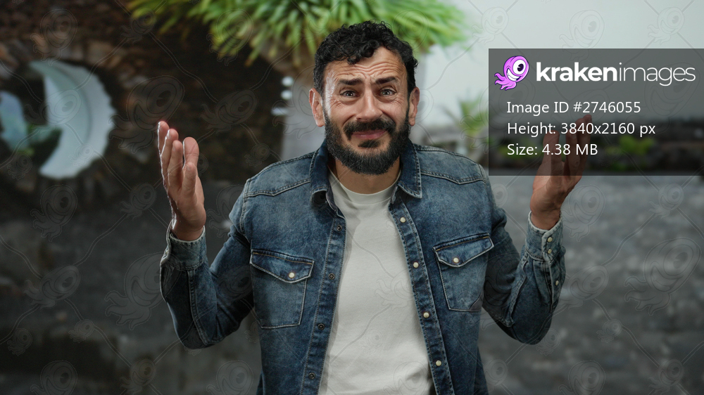 Hispanic man with a beard in denim jacket shrugs outdoors in a park, surrounded by green trees and relaxed urban scenery.