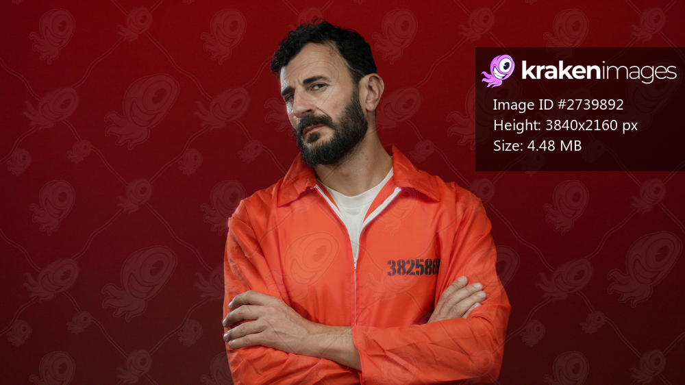 Hispanic man with a beard wearing an orange prison jumpsuit stands against a bold red background, exuding a serious demeanor.