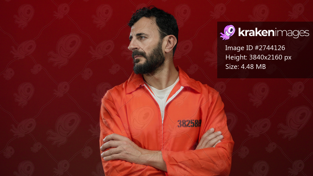 Hispanic man with a beard wearing an orange prison jumpsuit stands against a bold red background, exuding a serious demeanor.