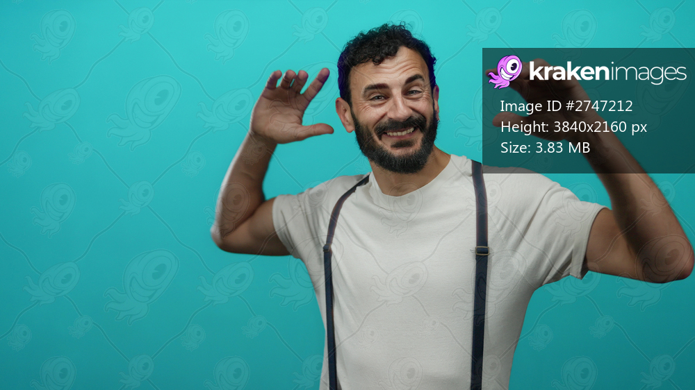 Hispanic man with a beard, wearing suspenders, playfully gesturing against a vibrant blue background, exuding joyful and cheerful energy.
