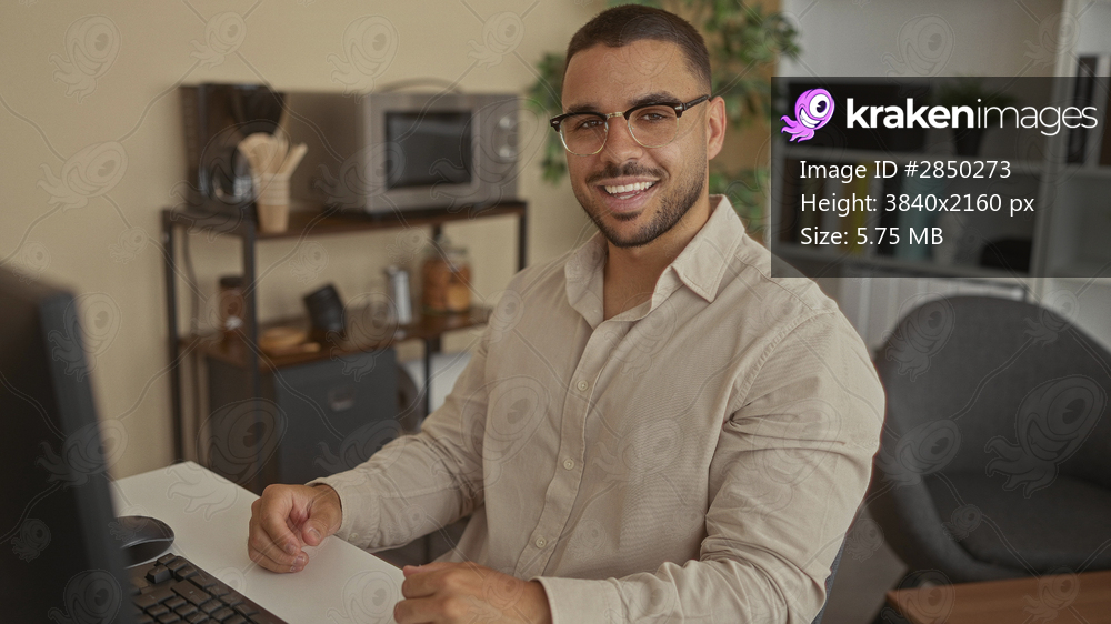 Hispanic man adjusts glasses at desk in building while seated upright and looking at screen; focus concentration.