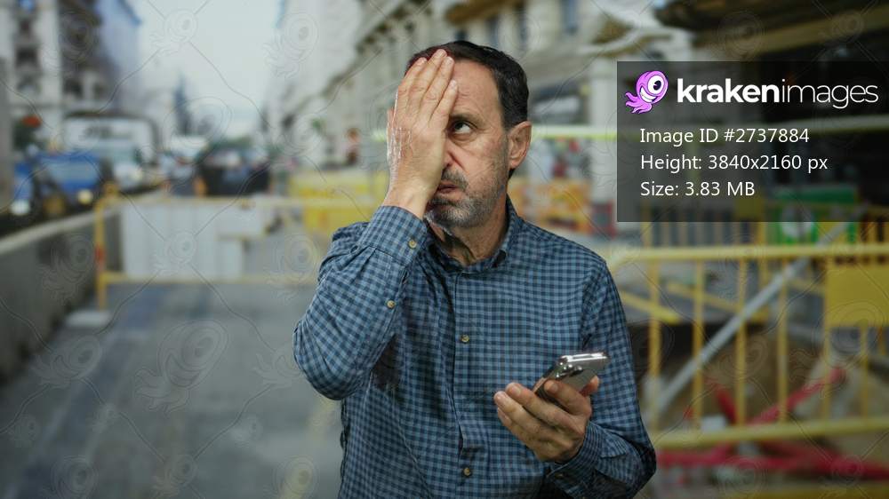Hispanic man at construction site looking at smartphone with puzzled expression, reflecting confusion amid urban setting, showcasing adult male engaging with technology outdoors. - Kraken Images