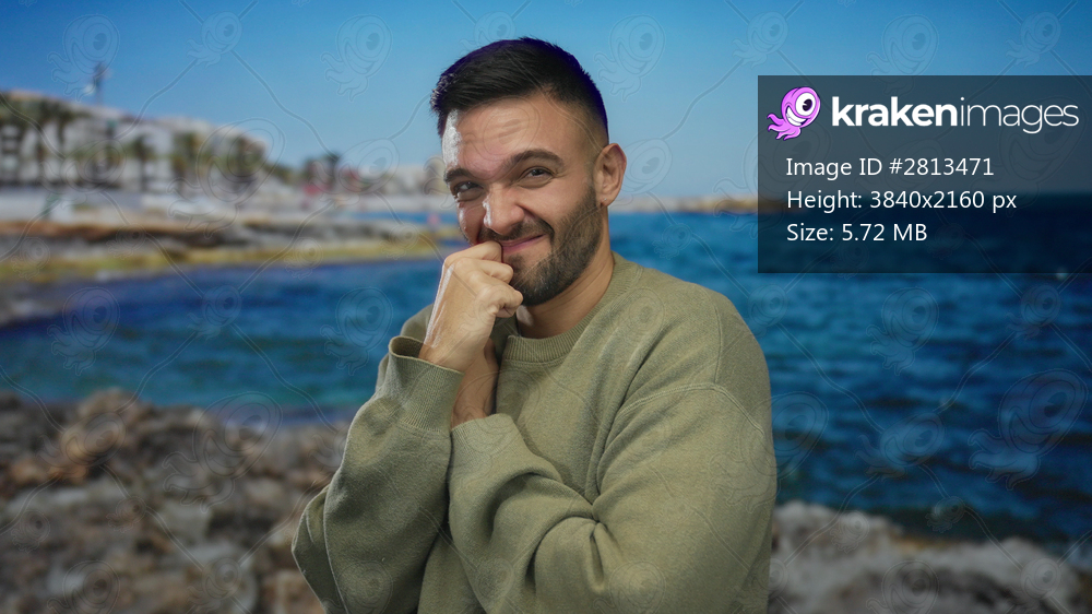 Hispanic man at seashore making a gesture of fear or disgust wearing a sweater, ocean in background, depicting a moment of surprise at the beach.