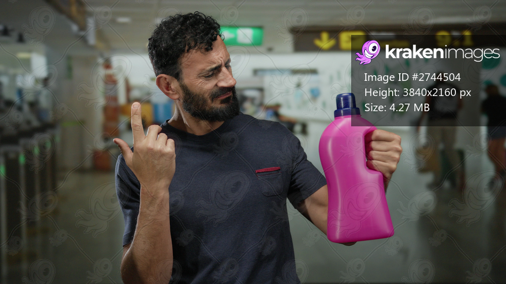 Hispanic man with beard confusedly examines a pink detergent bottle in busy airport terminal, illustrating travel challenges and product scrutiny.