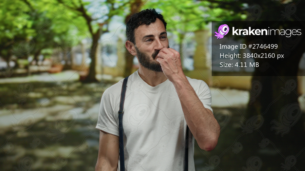 Hispanic man with beard doing chef kiss gesture in a lush green park setting surrounded by trees showcasing delight and satisfaction outdoors.