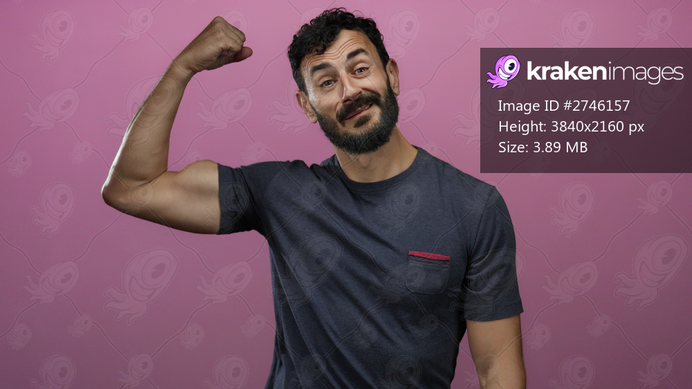 Hispanic man with beard flexing arm against vibrant pink background, wearing casual gray shirt and exuding confidence and strength with a playful side profile glance. - Kraken Images
