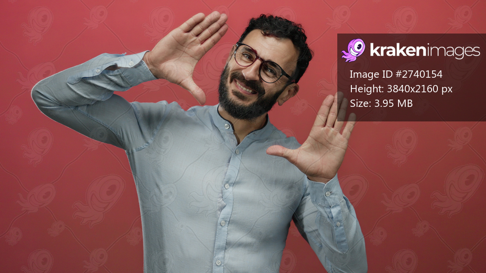 Hispanic man with beard frames face with hands against vibrant red background, wearing glasses and blue shirt, in expressive pose conveying creativity and focus. - Kraken Images