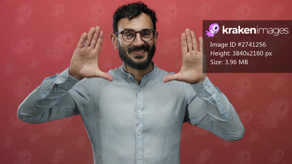 Hispanic man with beard frames face with hands against vibrant red background, wearing glasses and blue shirt, in expressive pose conveying creativity and focus. - Kraken Images