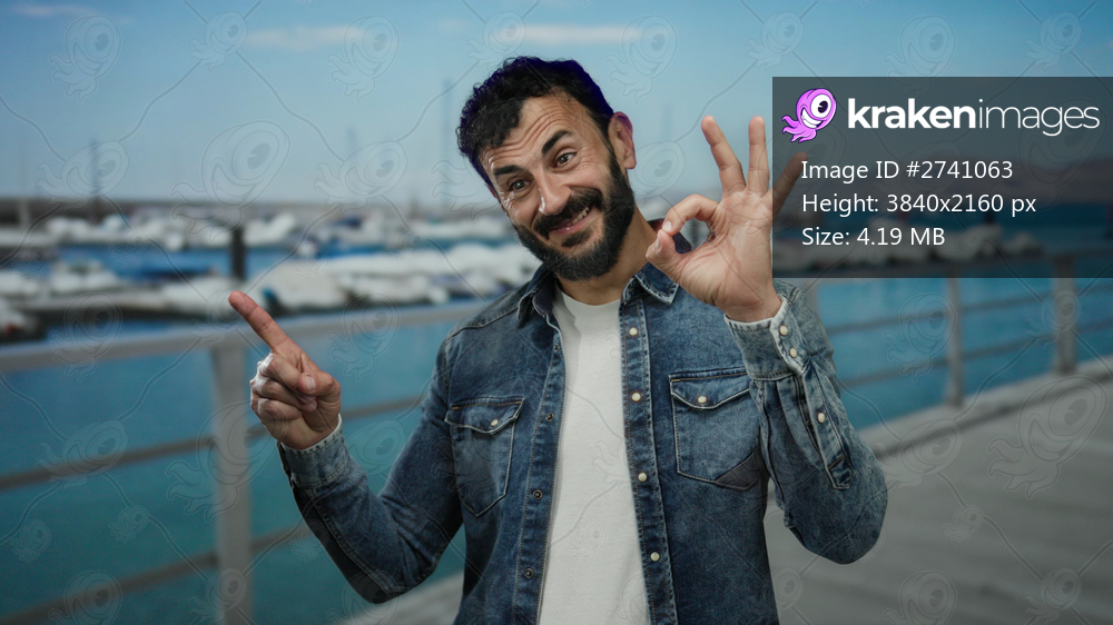 Hispanic man with beard gestures okay at a port with boats and a clear blue sea in the background, exuding a cheerful vibe in casual denim.