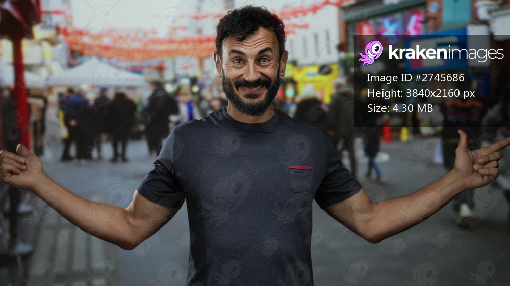Hispanic man with beard gestures playfully on a busy street with colorful flags, surrounded by blurred crowd in an urban outdoor scene during daytime.