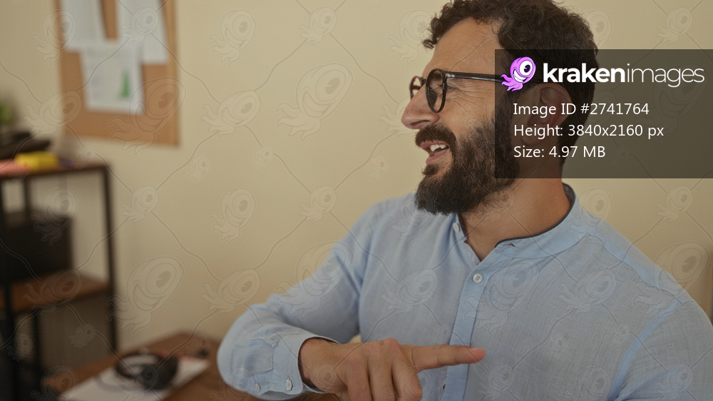 Hispanic man with beard gesturing confidently in an office setting with glasses and blue shirt surrounded by indoor decor and office equipment.