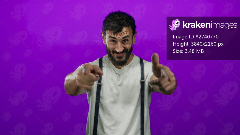Hispanic man with beard gesturing invitingly against a vibrant purple background wearing white shirt and suspenders expressing friendliness and warmth with open arms - Kraken Images