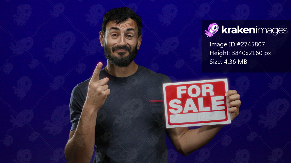Hispanic man with beard holding a for sale sign against a blue background, pointing confidently with a smile, showcasing an engaging sales pitch concept. - Kraken Images