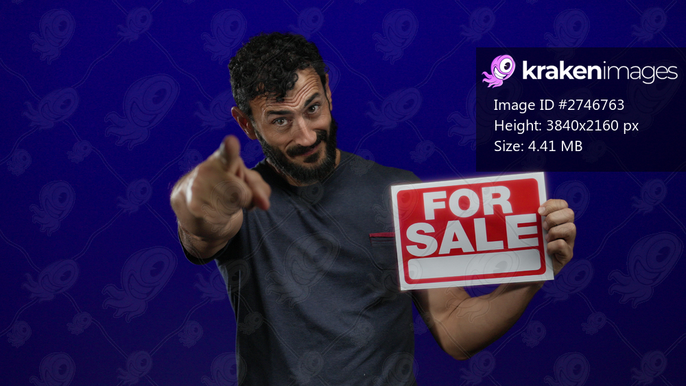 Hispanic man with beard holding a for sale sign against a blue background, pointing confidently with a smile, showcasing an engaging sales pitch concept. - Kraken Images