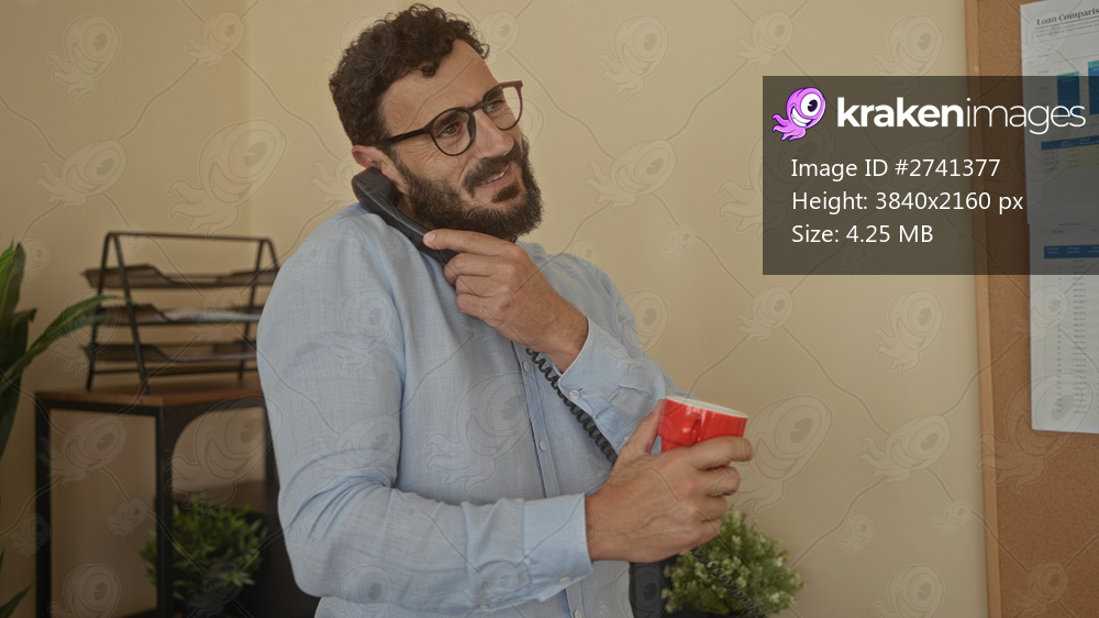 Hispanic man with beard holding a red cup and talking on phone in an office setting, surrounded by plants and paperwork, appearing engaged and professional. - Kraken Images
