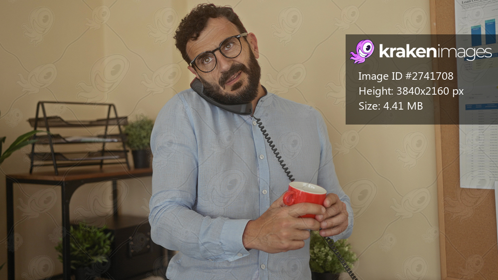 Hispanic man with beard holding a red cup and talking on phone in an office setting, surrounded by plants and paperwork, appearing engaged and professional. - Kraken Images