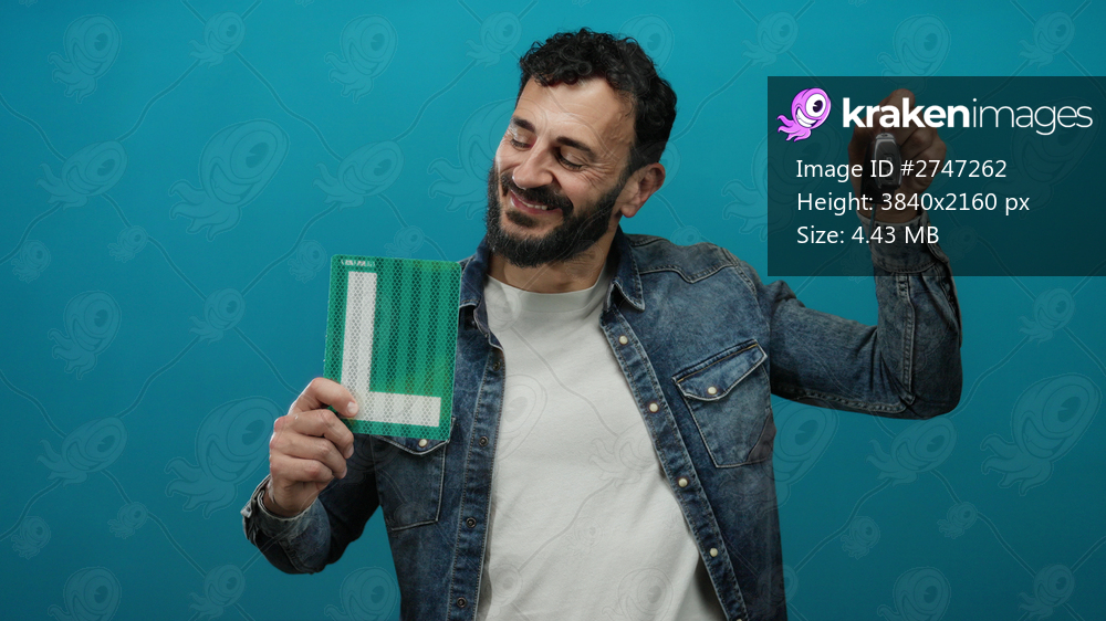 Hispanic man with beard holding car keys and learner sign confidently against blue background.