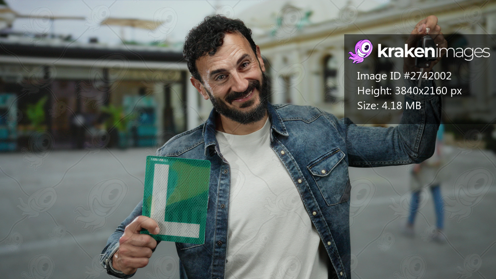 Hispanic man with beard holding car keys and learner sign outdoors on street, showcasing achievement in driving skills.