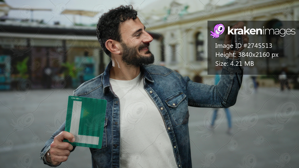 Hispanic man with beard holding car keys and learner sign outdoors on street, showcasing achievement in driving skills.