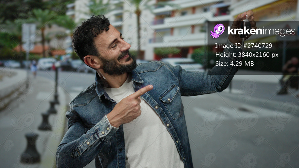 Hispanic man with beard holding car keys on a vibrant outdoor street scene, showcasing urban lifestyle and modern transportation amid bustling city background. - Kraken Images
